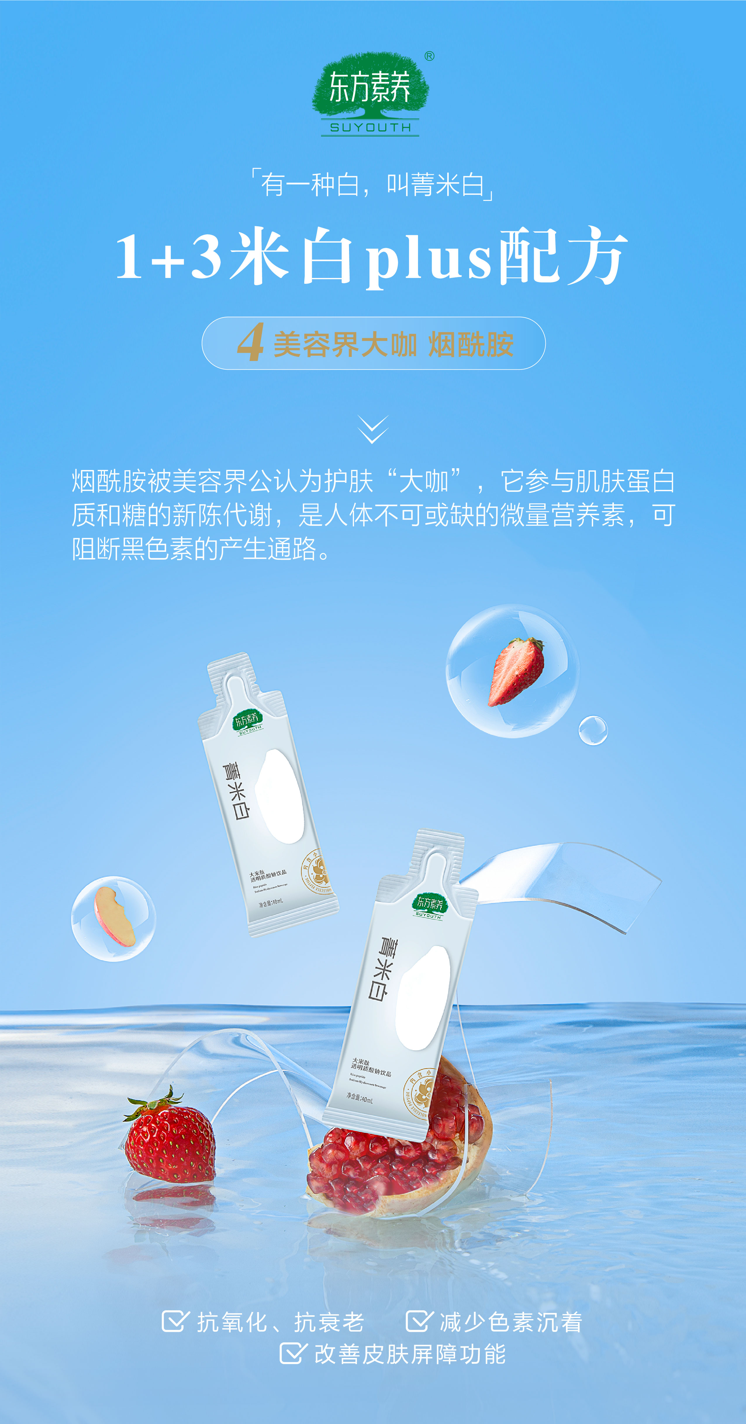 有一种白,叫菁米白!东方素养菁米白大米肽透明质酸钠饮品,独特的 1+3 米白 plus 配方超厉害:全能 “扫黑” 的大米肽,能抑制黑色素生成等;优质透明质酸钠,保湿锁水一流;深海 SOD 酵母粉,抗氧化能力超强;美容界公认美白大咖烟酰胺,阻断黑色素通路。想变白变美,就选它!